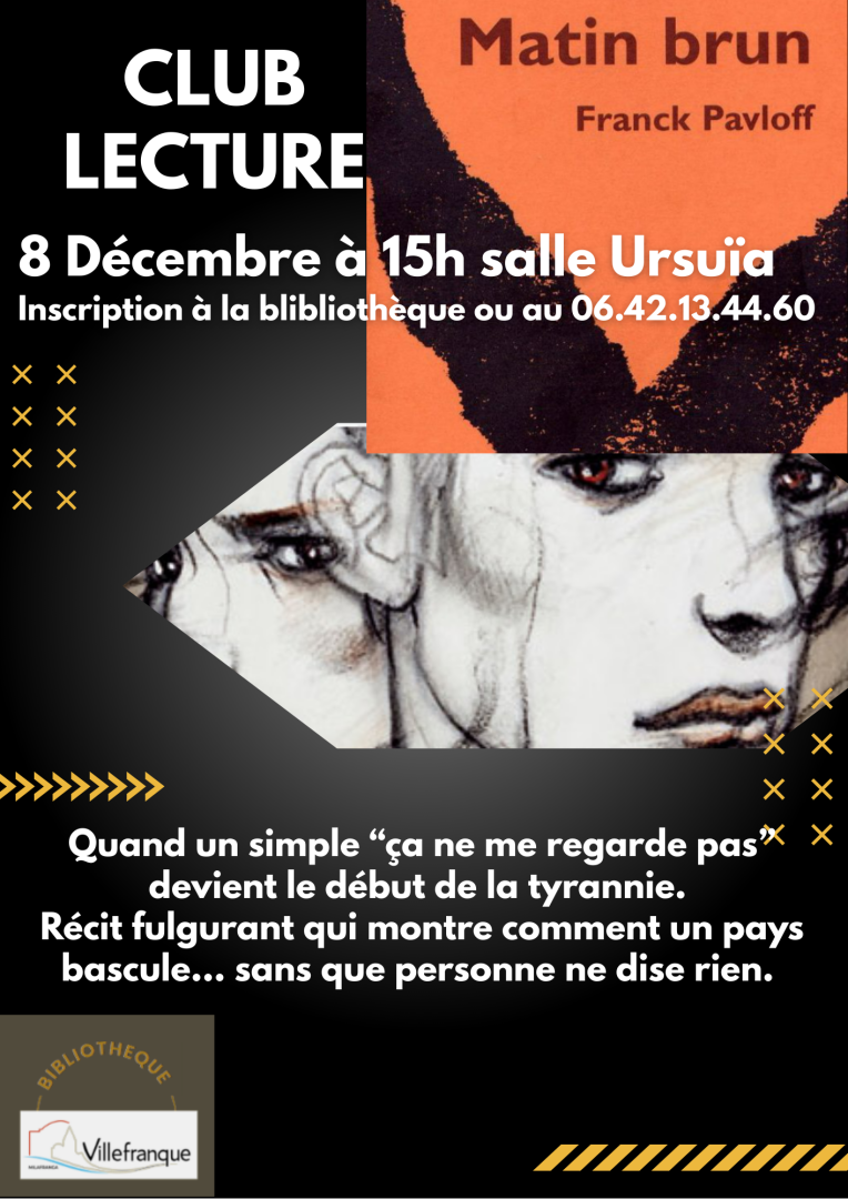 Rendez-vous à le 8 décembre 2025 à 15 heures à la Salle Ursuia pour le Club Lecture du récit "Matin brun" de Franck Pavloff.
