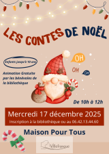 Les bénévoles de la bibliothèque sont heureuses de vous retrouver mercredi 17 décembre, de 10h à 12h à la Maison pour Tous pour vous faire écouter les contes de Noël.