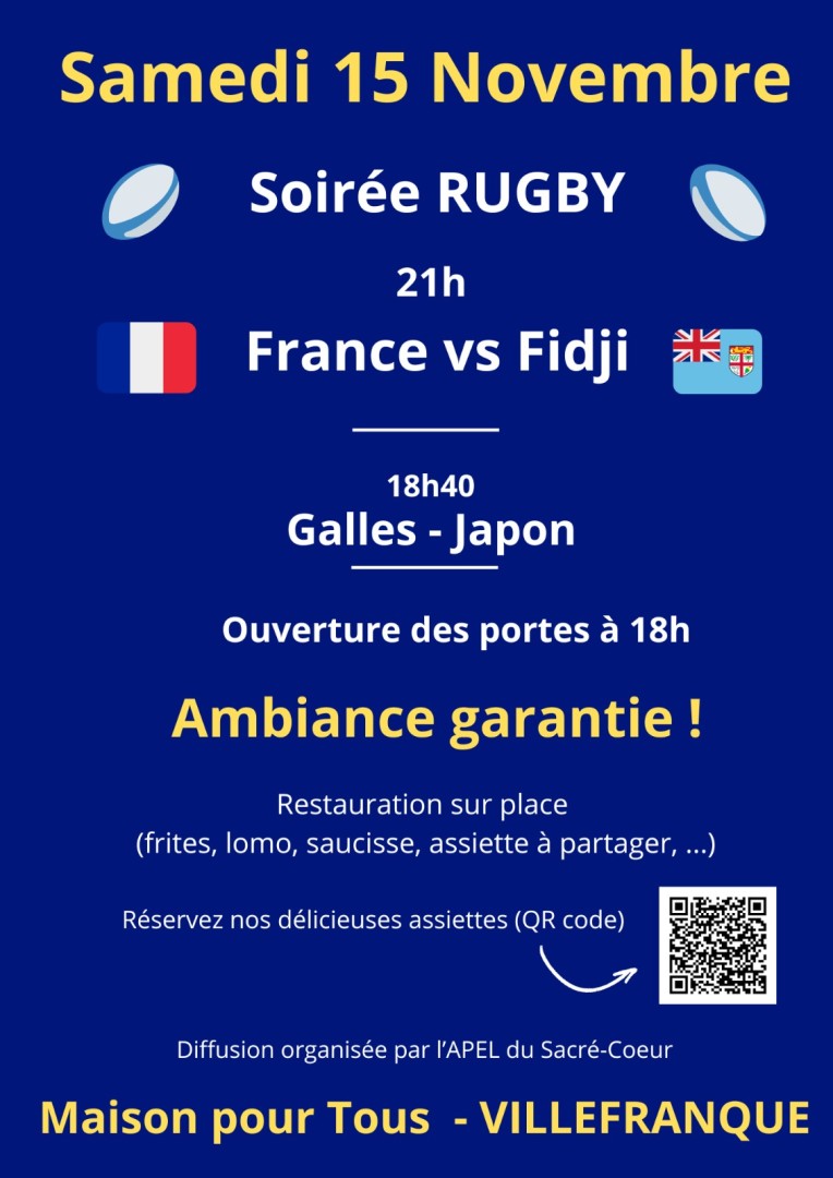L'APEL Sacré-Cœur Villefranque organise une soirée Rugby le samedi 15 novembre 2025 dès 18h00 à la Maison Pour Tous.
